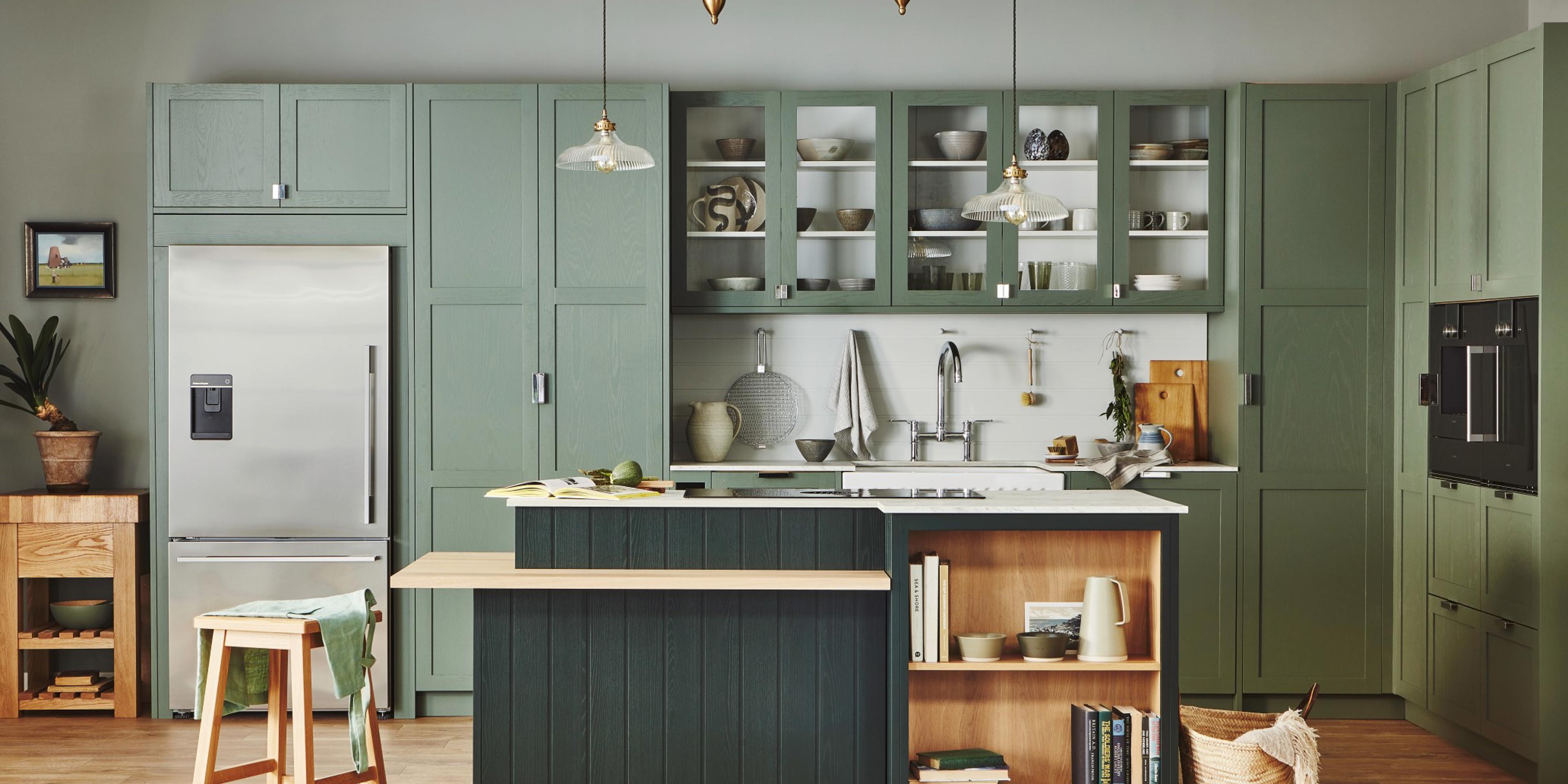 Die Küche St Giles von Naked Kitchens aus Norfolk ist ein schönes Beispiel für eine moderne Shaker-Küche. Mit einem Trio von Grüntönen und einer Frühstücksbar aus Eiche ist diese Küche ein Meisterwerk in der Verbindung von traditionellem Stil mit modernen Elementen.
