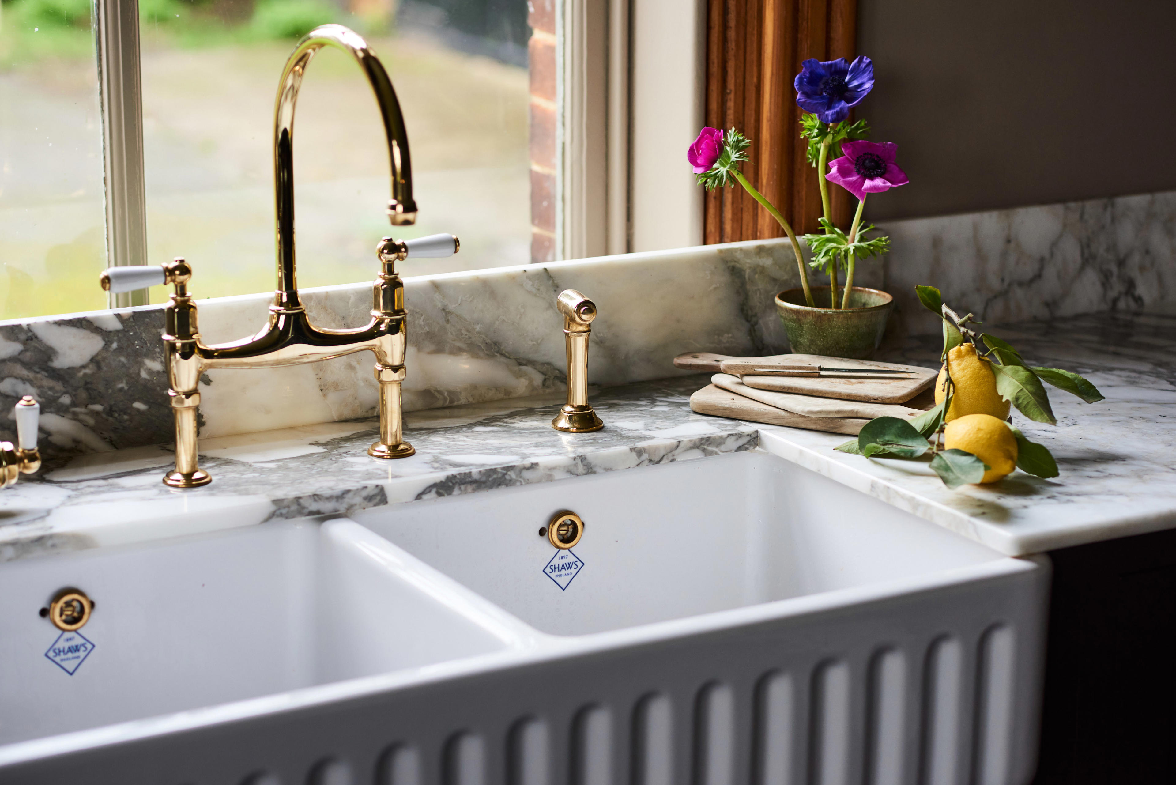 "Für mich ist der wichtigste Platz für die Spüle unter einem Fenster, aber das große, schöne Sprossenfenster mit Blick auf den Vorgarten fühlte sich nicht richtig an, und ich wusste, dass ein großer runder Tisch den Platz am besten nutzen würde. Meine reizende Freundin ist eine unglaubliche Food-Stylistin und Küchendesignerin, die mit Starköchen zusammenarbeitet, und ich habe sie um Hilfe gebeten. Sie warf einen Blick auf den Raum und sagte, es sei offensichtlich, dass die Spüle unter dem Seitenfenster platziert werden sollte. Es ist wirklich der traumhafteste Ort, um in der herrlichen Shaws of Darwen Ribchester Spüle Geschirr zu spülen und dabei die Vögel in den Bäumen zu beobachten, während die Sonne am späten Nachmittag hereinscheint. Wer hätte gedacht, dass Abwaschen so schön sein kann? Mit meinem Doppelwaschbecken ist es so viel weniger lästig. Ich liebe die beiden Waschbecken, weil ich eines als Abtropfschale benutze, anstatt ein Abtropfbrett zu haben."