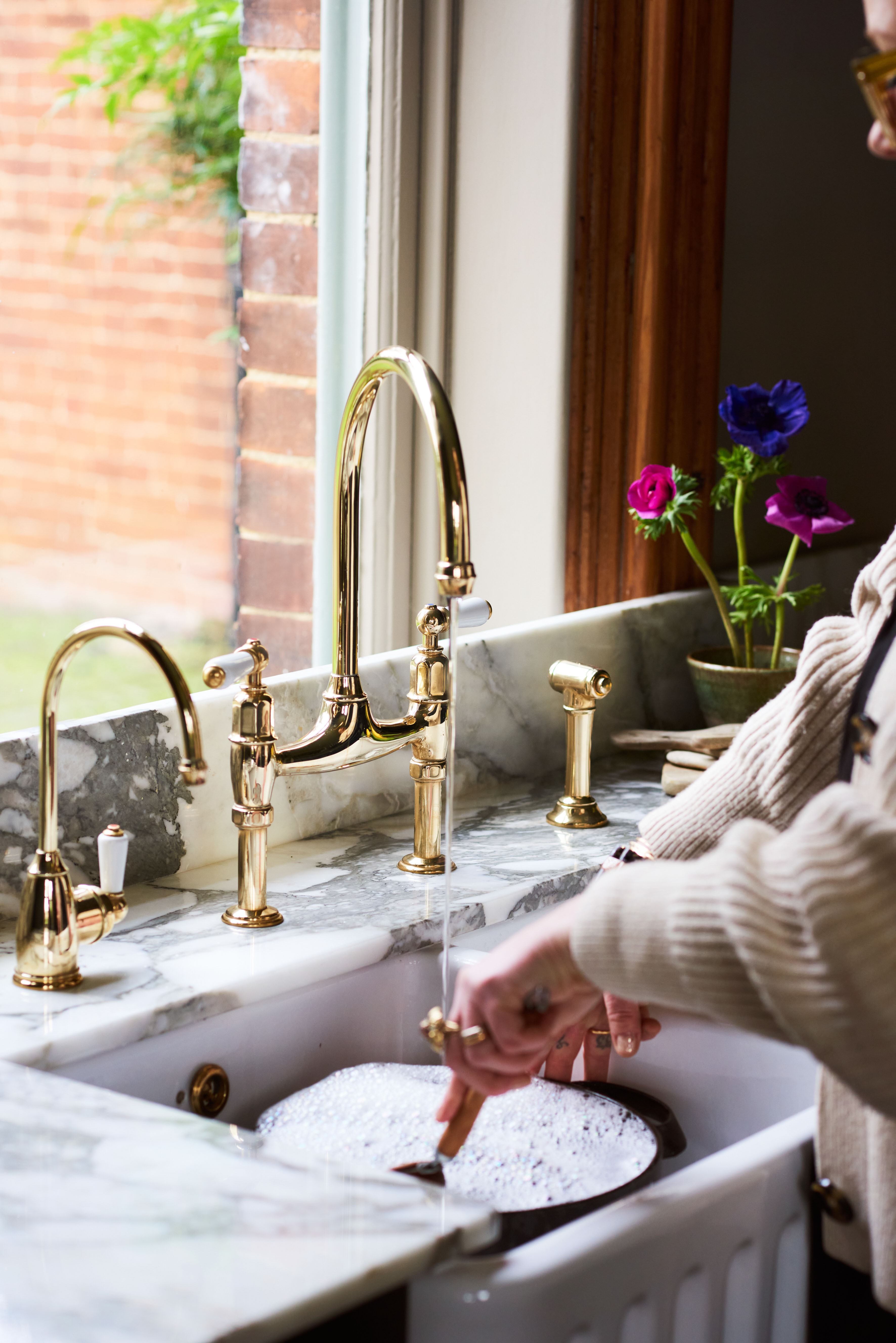 "The Perrin & Rowe instant hot water tap makes making a cup of tea so much easier, no longer do I hang around waiting for the kettle to boil! The pan filling tap above the stove is not only aesthetically pleasing but also makes cooking easier and takes the pain out of carrying pans of water across the kitchen to your stove. The beautiful brassware is easy to clean and the look elevates my entire stove area. We polish it every week and it's such a joy to see it shine."