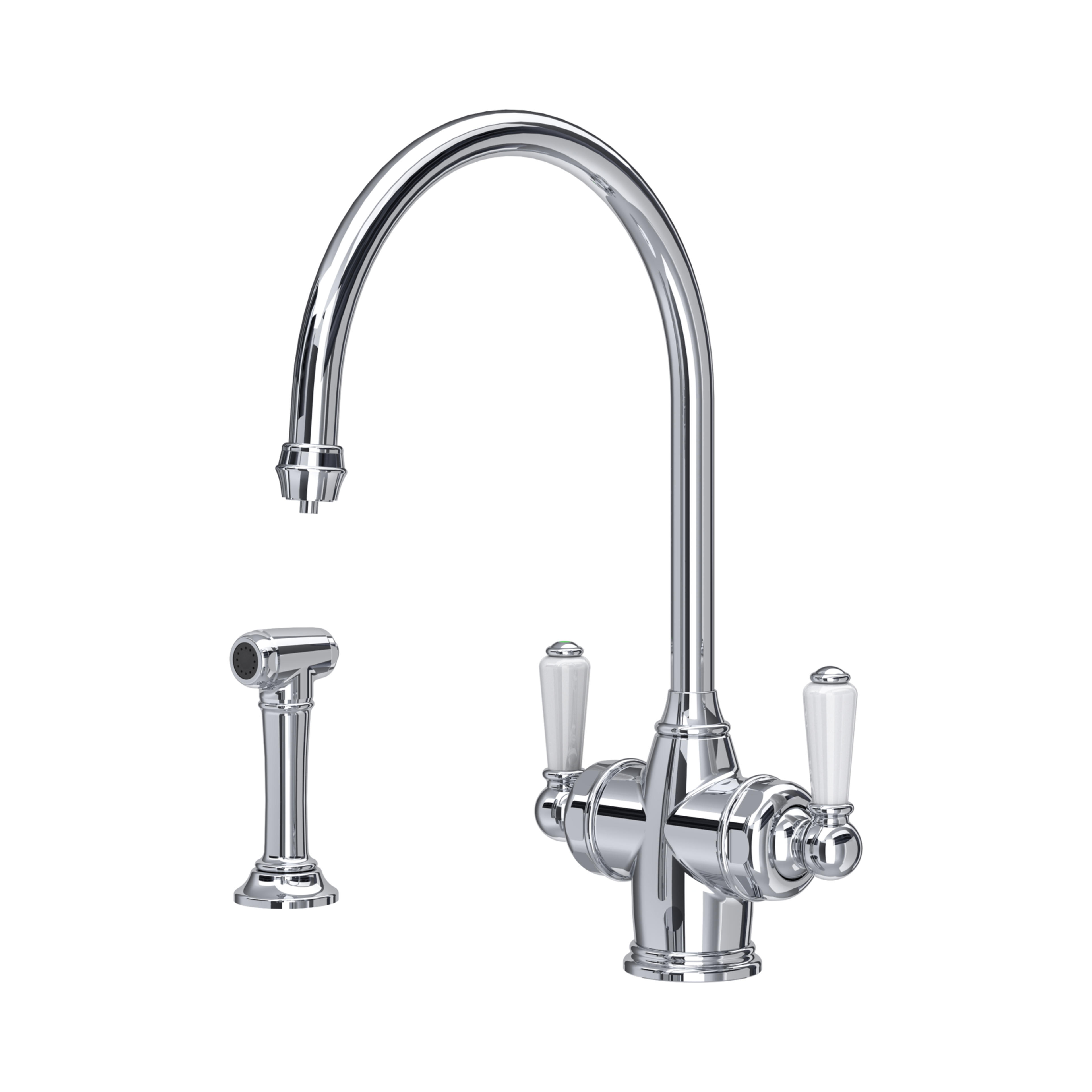 Beautifully classic in style, without compromising on technology, our two-lever Phoenician mixer with built-in filtration is offers hot and cold water as well as filtered drinking water. This version comes with a deck-mounted side rinse.