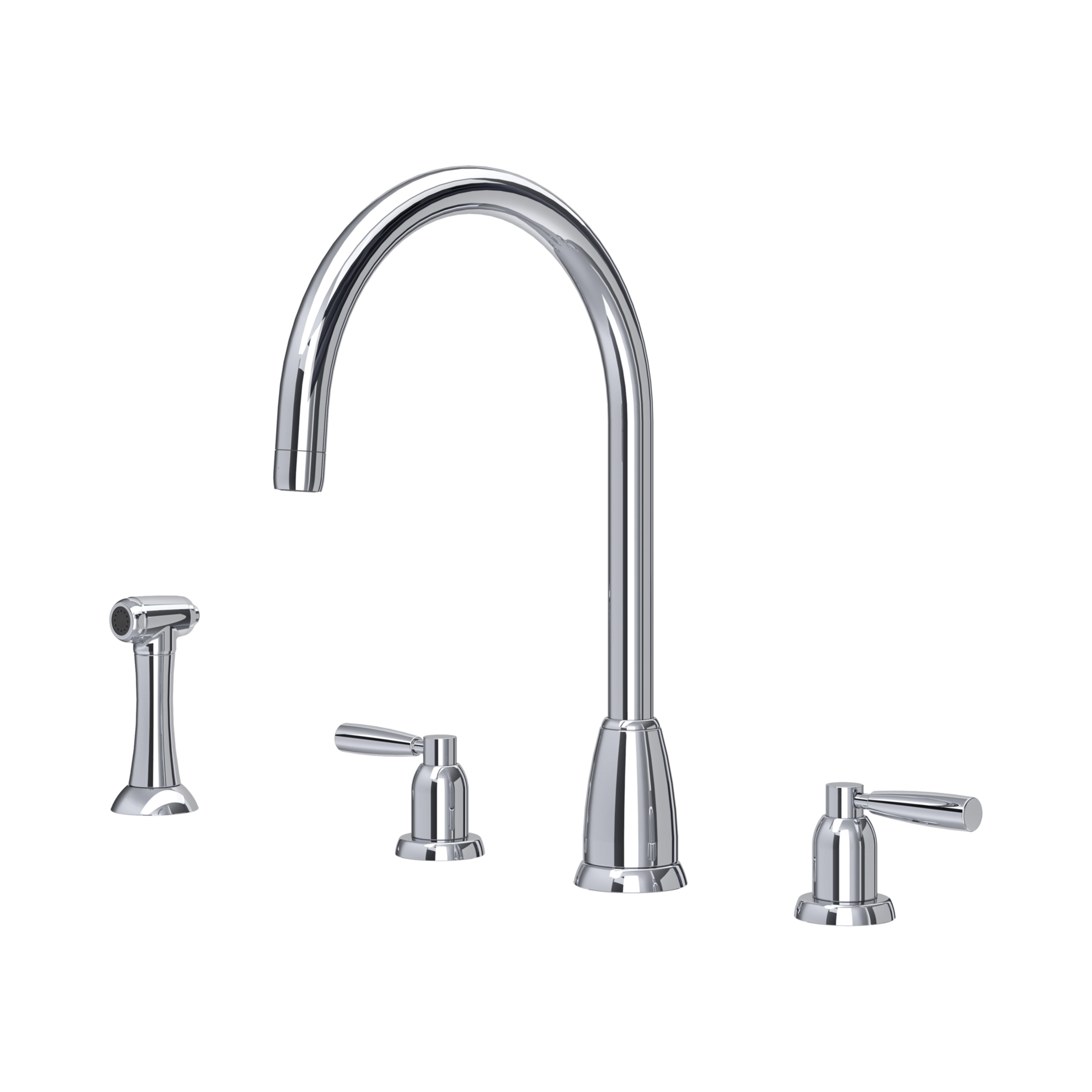 Questa versione del miscelatore diffuso per lavello da cucina Langbourn è dotata di un bellissimo rubinetto curvo a C, maniglie a leva per l'erogazione di acqua calda e fredda, oltre a un pratico erogatore a doccetta laterale per facilitare le operazioni di cottura, pulizia e riempimento di pentole e padelle di grandi dimensioni.